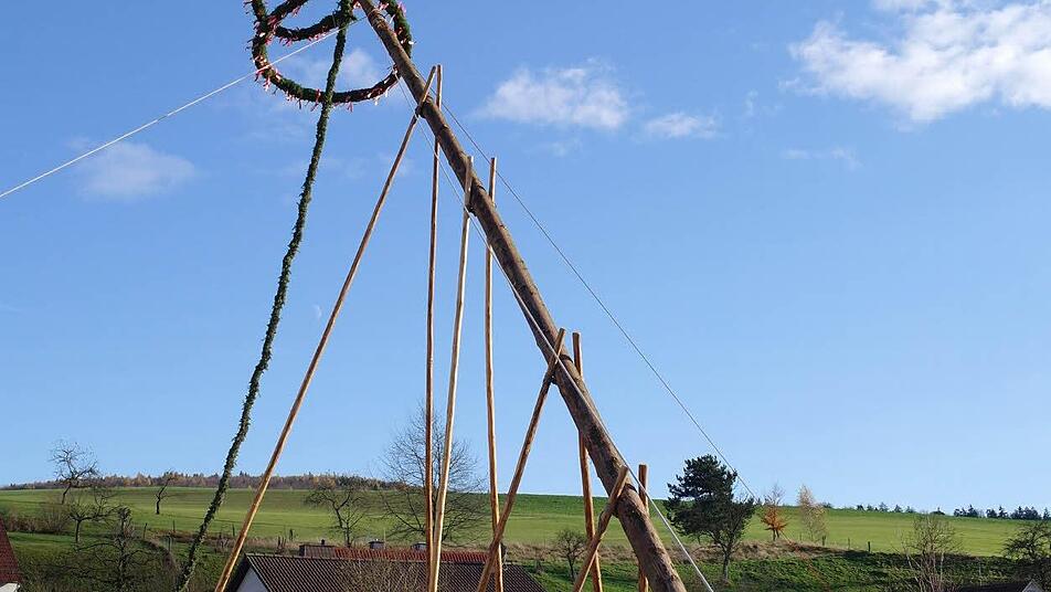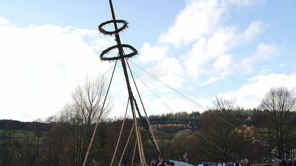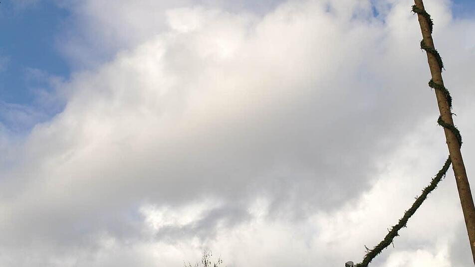 Harald Hembacher kletterte mit Steigeisen auf den Kirmesbaum und löste die Seile, eine Theke wurde am Stamm befestigt, damit beim Kirmestanz eine Ablagefläche für die Weinflaschen vorhanden war. Der dritten Zeltkirmes stand nichts mehr im Wege.