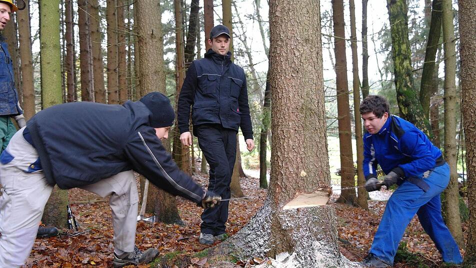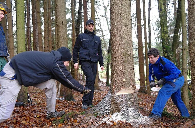 Besonders viele Kriterien musste sie auch nicht erfüllen. "Strack muss sie ein", erklärte ein Kirmesbursch, wobei strack vor allem gerade bedeutet. "Und sollte nach was aussehen", ergänzte Simon Möller. Der 16-Jährige war heuer zum ersten Mal direkt dabei. Seit seiner Kindheit hatte er immer hinter den Kirmespaaren gestanden. Fest anpacken musste er auch gleich, denn ein Baum mit einem Viertel Meter Durchmesser fällt sich nicht von selbst. Das geschieht in Kothen traditionsgemäß mit der Handsäge.