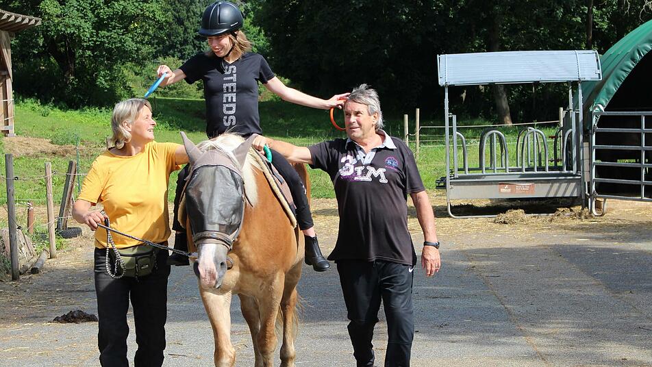 Laura Martin aus Römershag reitet schon seit ihrem fünften Lebensjahr bei Familie Beck. "Für sie ist das Gleichgewicht besonders wichtig - und das Vertrauen", sagt ihre Mutter Gerlinde Martin. Dass Laura sich so weit alleine bewegen kann, sei auch ein Ergebnis der vielen Therapien. Neben der Reittherapie bekomme die junge Frau Logopädie, Ergotherapie, Physiotherapie und Feldenkrais. "Aber hier auf dem Pferd, da strahlt sie am meisten", sagt Gerlinde Martin.