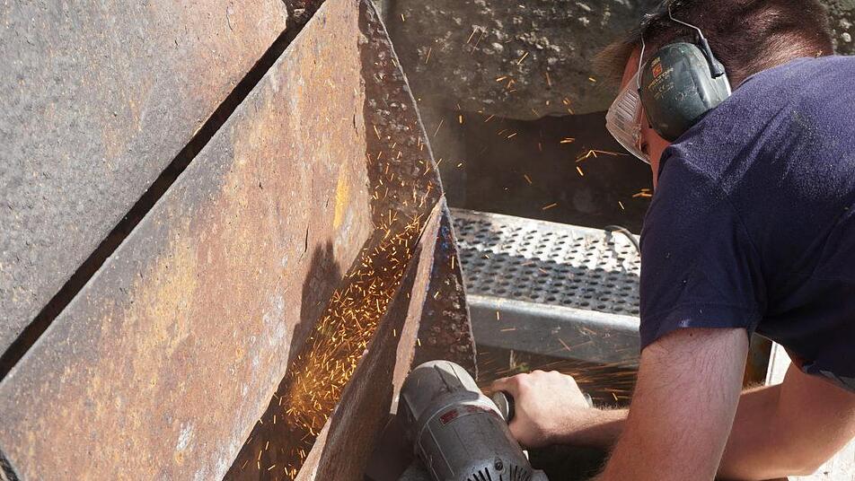 Dann wurde es spannend. Oliver Schwenzer und Stefan Leitsch jeweils mit einer Flex bewaffnet kletterten in das Mühlrad. Ein Gerüst sorgte für die nötige Standfestigkeit. Helle Funken stoben. "Das Metall ließ sich wie ein Stück Papier durchschneiden", befand Schwenzer. Als letztes wurden die hölzernen Streben durchtrennt. Das Mühlrad war in zwei Teile zerlegt. Mit dem Frontlader wurde der obere Teil aus dem Mühlgraben gehoben und zur Seite gefahren.