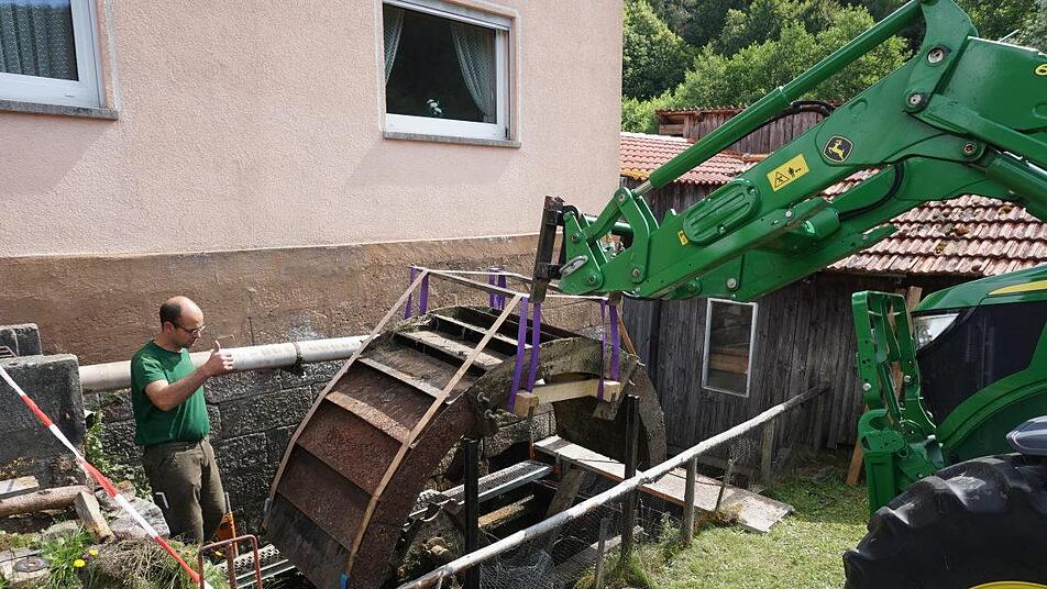 Das alte Mühlrad der Michelsmühle war nicht mehr zu retten. Nun bauten die Besitzer es ab. Wenn die Corona-Situation es zulässt, kann es beim nächsten Mühlenfest bestaunt werden.