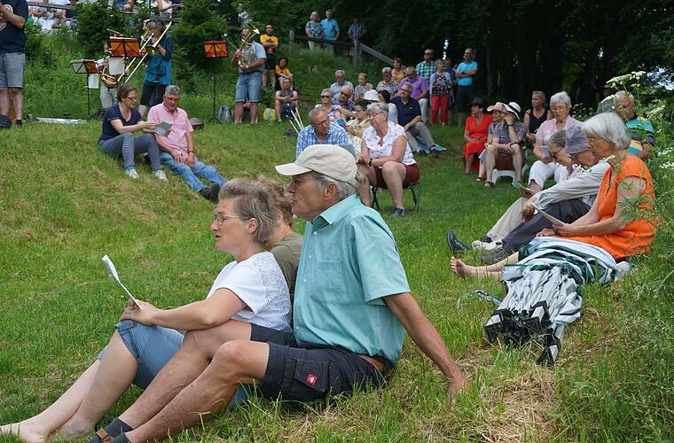 Dank der gesunkenen Indizenzwerte war es kurzfristig möglich, diesen Gottesdienst zu organisieren. Dekan Büttner dankte den Wirtsleuten vom Neustädter Haus sowie dem Dekanatsposaunenchor Bad Neustadt, der unter Leitung von Christoph Schindler für die Musik sorgte. "Geh aus, mein Herz, und suche Freud in dieser lieben Sommerzeit", war eine Hommage an die Schönheit der Natur und mit "Lobe den Herrn", wurde ein Lobpreis zur Ehre Gottes gesungen.