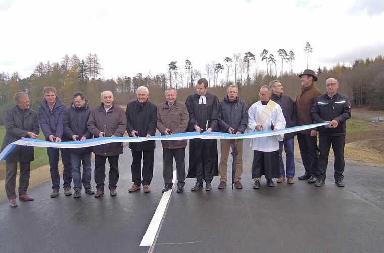 Pünktlich zur Segnung der neuen Straße öffnete sich die Wolkendecke für kurze Zeit. Dies sei der krönende Abschluss einer insgesamt reibungslosen und zügigen Baumaßnahme, erklärte Steffen Kiesel von der Tiefbauverwaltung des Landkreises Bad Kissingen freudig. Zur Erinnerung: Im August 2014 konnten die staatlichen Zuwendungen für den ca. drei Kilometer langen Abschnitt beantragt werden, und Anfang 2015 wurde die Maßnahme als förderfähig anerkannt und zur Ausschreibung zugelassen. Im März schließlich stimmte der Wirtschafts- und Umweltausschuss der Vergabe der Bauarbeiten an die Firma Gebr. Stolz aus Untererthal zu.