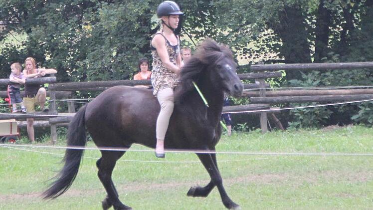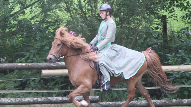 Auch die kleinen Voltigierer - also Turner zu Pferde - hatten ihren Auftritt. Die kleinsten Reiter des Festes zeigten einige Figuren auf den Tieren. Aber auch die unterschiedlichen Gangarten der Pferde wurden vorgestellt. So zeigte Dominik Lürken auf seinem Großpferd die Gangarten Schritt, Trab und Galopp. Madeleine Eiter präsentierte auf ihrem Isländer noch Tölt und Rennpass.