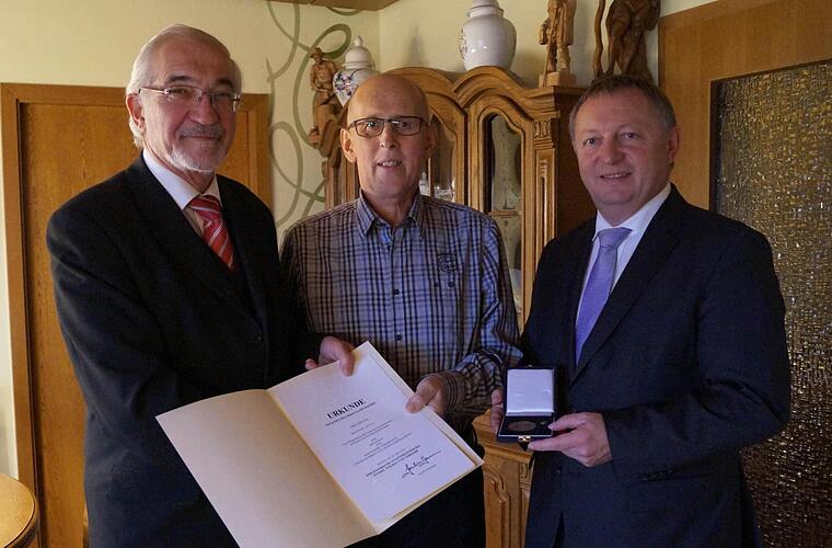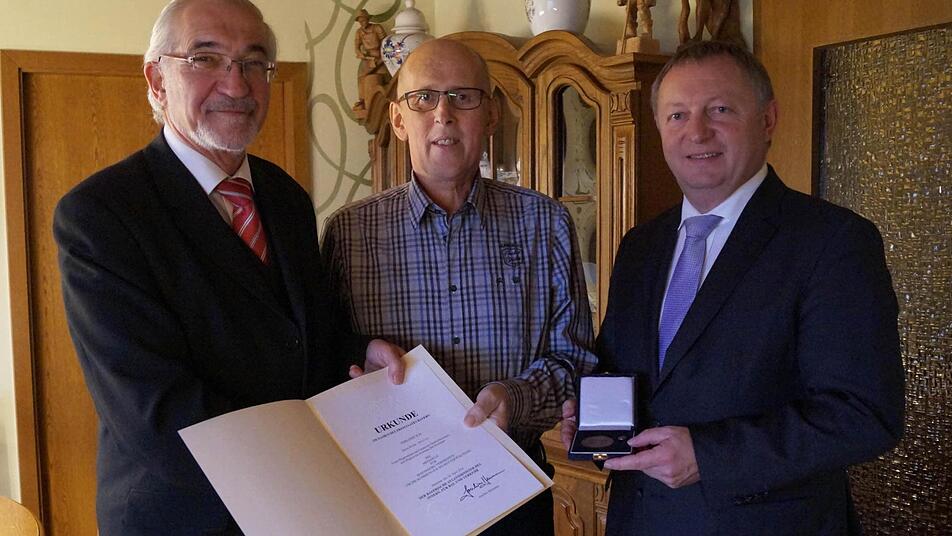 Da der ehemalige Oberleichtersbacher Bürgermeister Walter Müller aus gesundheitlichen Gründen nicht zur Ehrungsveranstaltung nach Würzburg kommen konnte, wurde die Auszeichnung am Donnerstag bei ihm zu Hause durchgeführt.