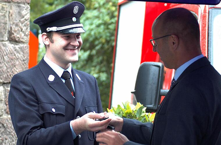 Am vergangenen Wochenende haben der katholische Pfarrer Florian Judmann und seine evangelische Amtskollegin Daniele Roth das Tragkraftspritzenfahrzeug (TSF) gesegnet. Bereits im März hatte Kommandant David Kretschmann das TSF in Rendsburg im hohen Norden abgeholt; mit drei Feuerwehrkameraden, einem auf gerade mal 100 km/h begrenzten Feuerwehrfahrzeug ohne Radio und viel Vorfreude. "Da kann man was erleben", schmunzelte Kretschmann.