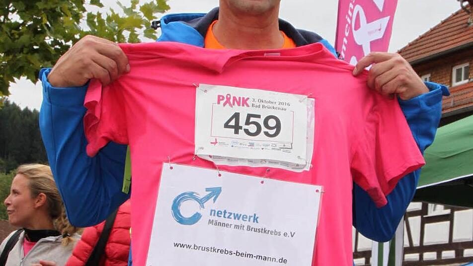 "Männer mit Brustkrebs", steht darauf. Kirchner hat der Brustkrebs erwischt, obgleich nur etwa 600 Männer pro Jahr in Deutschland erkranken. Zum Vergleich: Bei Frauen sind es ungefähr 70.000 Neuerkrankungen jährlich. Nun macht er, wo immer es geht, auf die Tatsache aufmerksam, dass Brustkrebs auch Männer treffen kann. "Viele denken immer noch: Das gibt's gar nicht", ist seine Erfahrung. Weil vor drei Jahren ein ähnlicher Solidaritätslauf in München ausgebucht war, stieß er übers Internet auf die Aktion in Bad Brückenau. Dafür nimmt er auch die lange Anfahrt von etwa drei Stunden mit Zug und Bus aus Mainaschaff bei Aschaffenburg in Kauf.