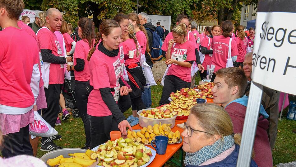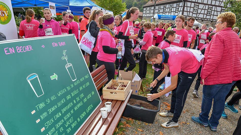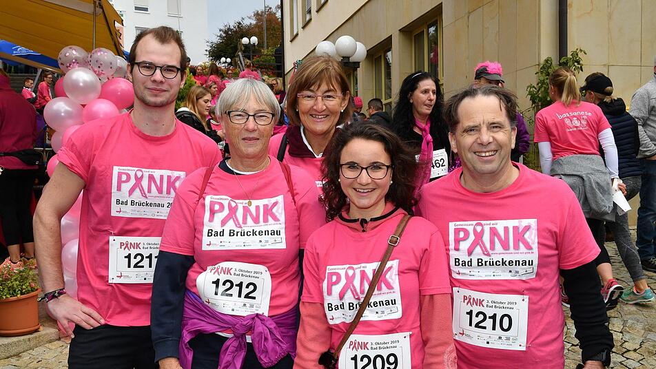 Der Erste erreicht das Ziel nach 34 Minuten, doch darum geht es gar nicht. "Und wenn wir die letzten sind, wir warten auf dich!", sagen ihre Schwestern zu Claudia Weber aus Sulzthal. Im Juni musste sie sich der Diagnose Brustkrebs stellen. "Ich habe mir das ganz fest vorgenommen. Ich laufe da mit", sagt die 53-Jährige, und zieht es auch durch. Etwa 20 Leute aus ihrer Familie und von ihren Freunden laufen als "Claudias Team" mit. "Das ist Ehrensache", sagt Nicole Höchner. Sie hat ihr 13 Wochen altes Baby dabei.