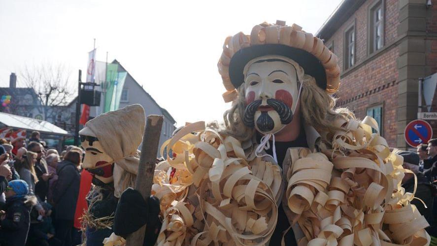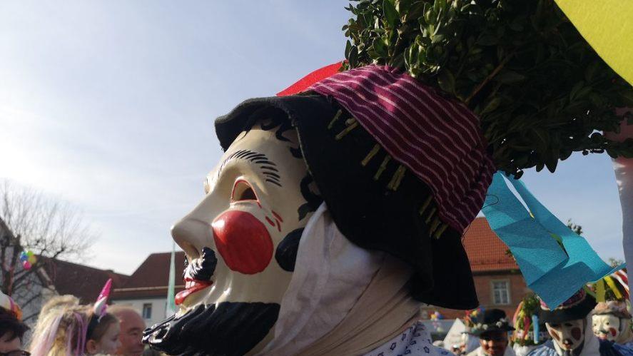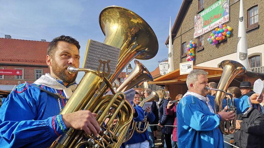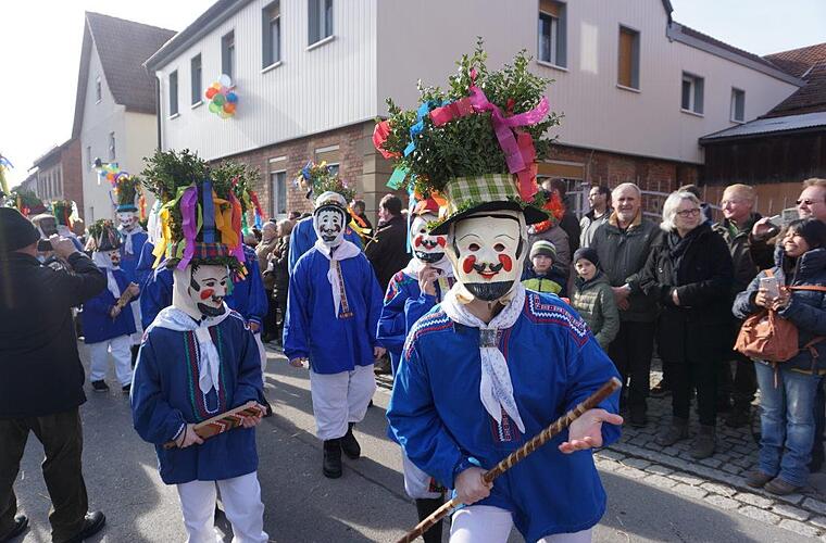 Doch nicht nur der Till von Franken war bei der Rhöner Maskenfastnacht zu bestaunen, sondern die für Oberelsbach und seine Ortsteile so typischen Holzmasken gab es in Aktion zu erleben. Da knurrten und drohten die Oberelsbacher Spannmänner ins Publikum, die Strohmänner hatten Knüppel und Ketten dabei, die sie auch einzusetzen wussten.