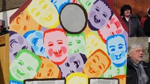 Nach der detaillierten Vorstellung der Masken mit alle ihren Besonderheiten, die für die wissenschaftliche Forschung von Bedeutung sind, konnte die Party weiter gehen. Die Musik spielte wieder, und Fredi Breunig erklomm die eigens für ihn errichtete Bütt auf dem Marktplatz, über dem auch noch der Pleitegeier kreiste. Vom großen Weltgeschehen kam er sehr schnell auf Bayerns Landespolitik und natürlich Oberelsbach zu sprechen. Birgit Erb ist für ihn die "schwarze Squaw von Oberelsbach", die es wie sonst niemand versteht, Fördermittel locker zu machen, was sie allerdings vor kurzem in Kuba wollte, war ihm in diesem Zusammenhang ein Rätsel. Dem Fastnachtsprediger war es schon beinahe peinlich auf das sanierte Rathaus zu blicken. "Da habe ich vor zwei Jahren die Dachrinne angemahnt. Da blätterte die Farbe ab. Und heute stehe ich hier, und das komplette Rathaus ist saniert. Wenn ich was sooch, is des nedd immer ernst gemeint."