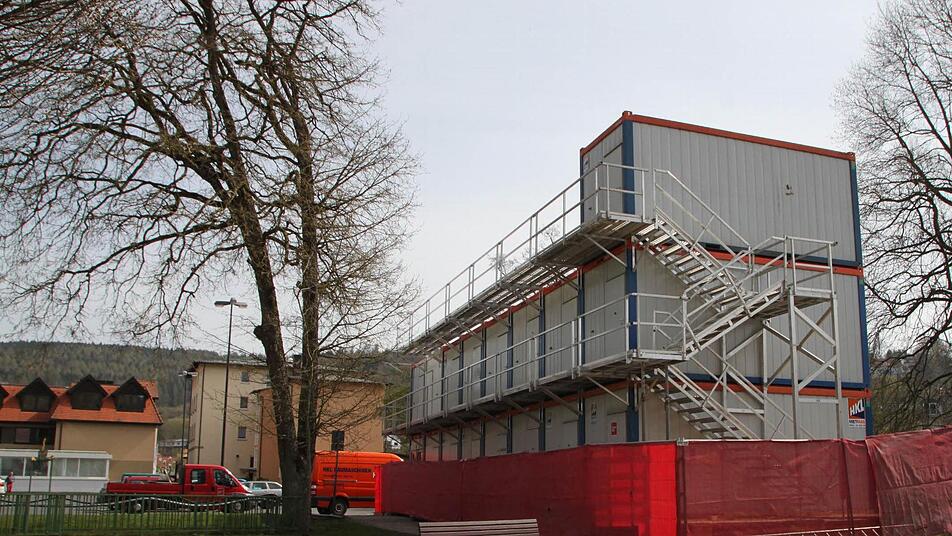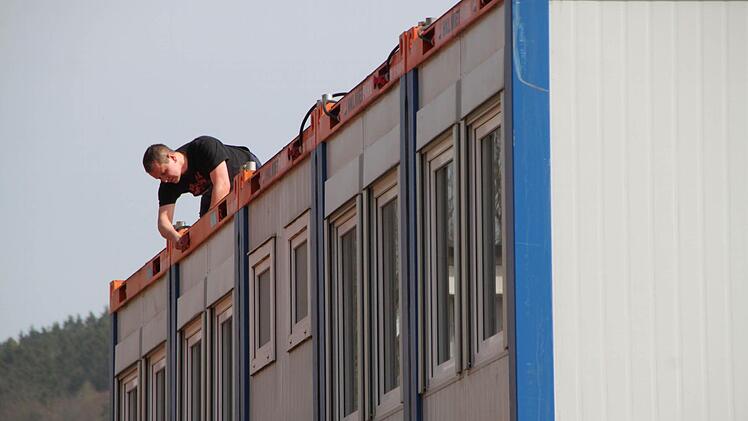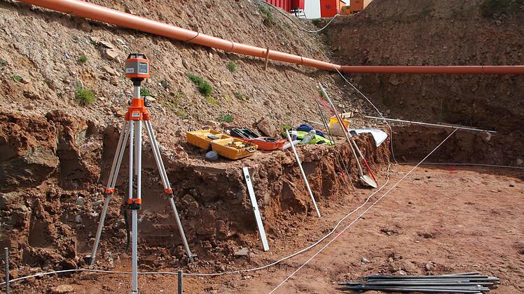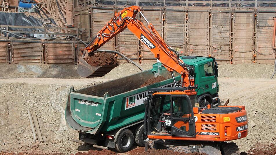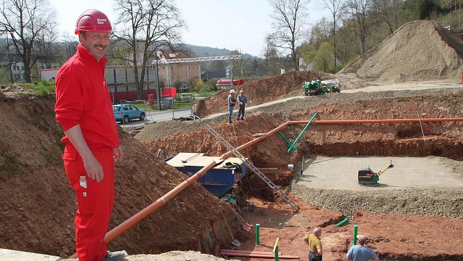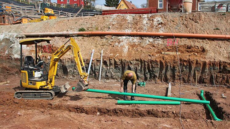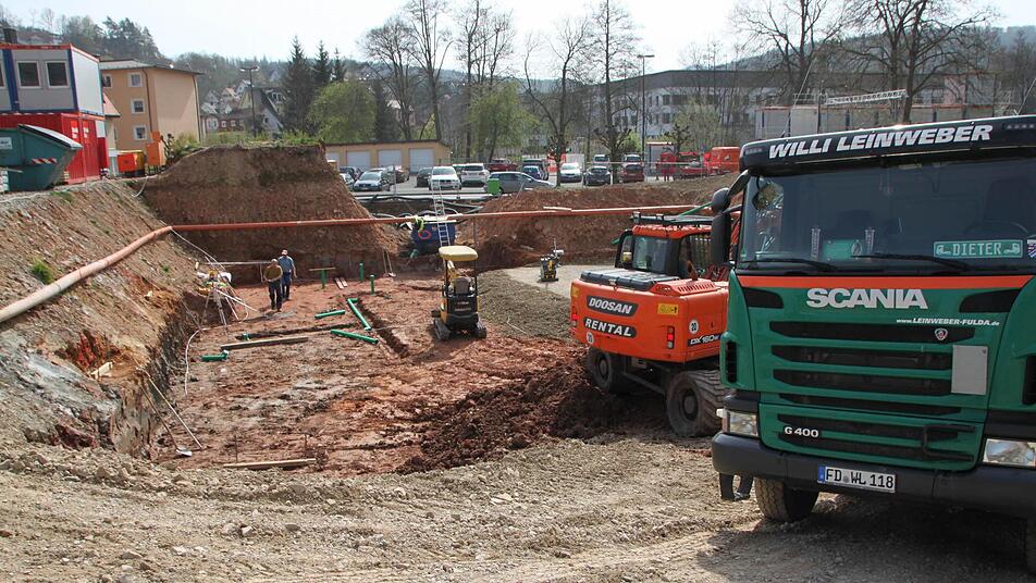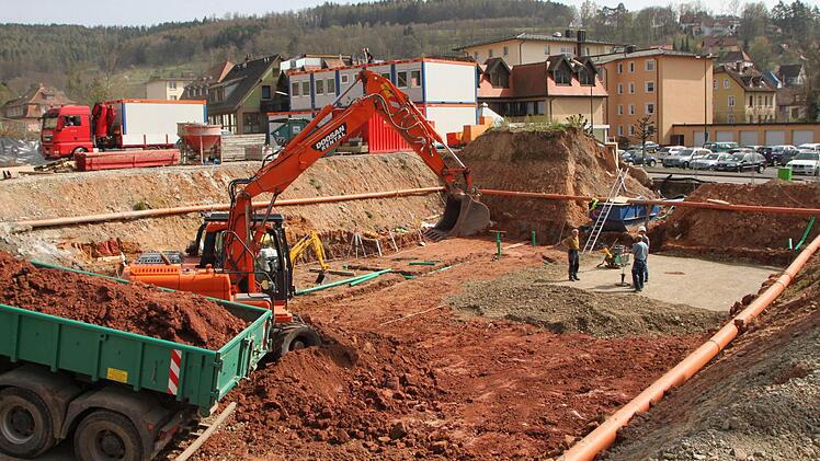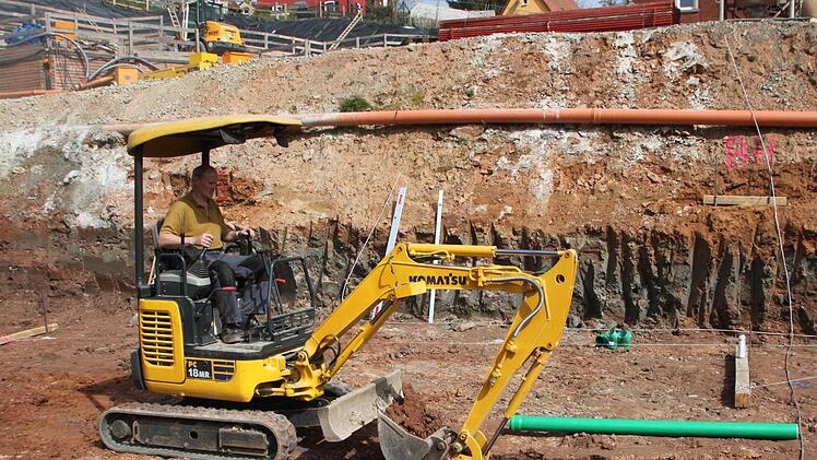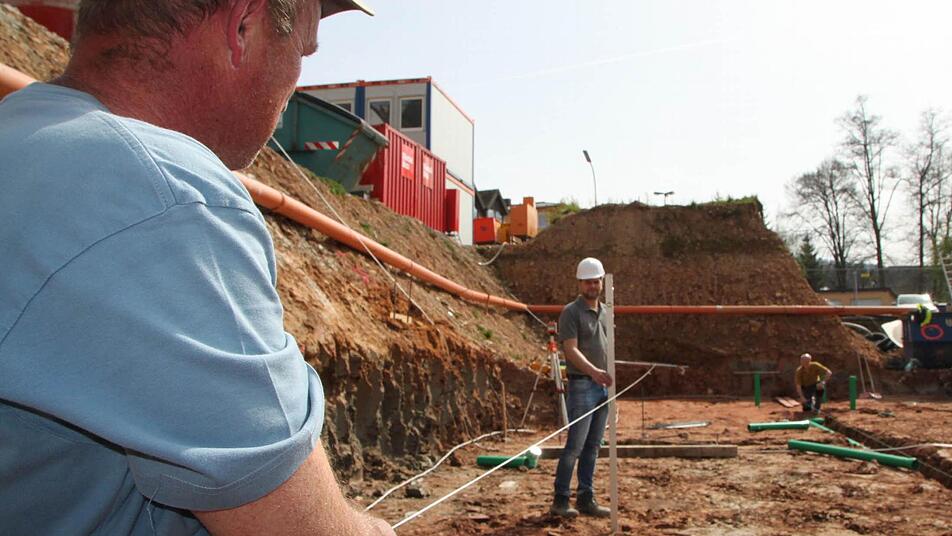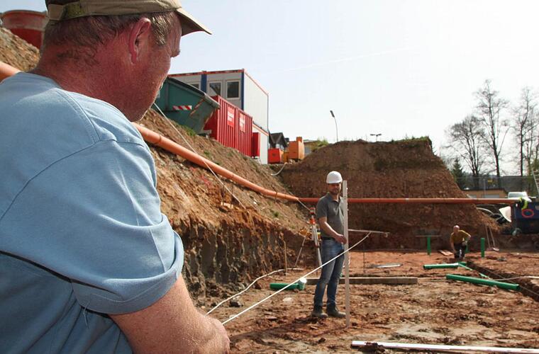 Baustelle wird eingerichtet Jetzt aber geht es los. Scheppernd rollen Laster über die Baustelle. Auf dem Parkplatz an der Musikschule stehen Wohn-Container, Leitungen werden verlegt. "Wir sind dabei, die Baustelle einzurichten", sagt Oberbauleiter Andreas Ollertz. Parallel dazu heben die Arbeiter bereits die Baugrube aus. "Zuerst wird die Tiefgarage gebaut. Dann folgen die nächsten Ebenen", erklärt Alexander Weber, Bauleiter bei der Firma Willi Leinweber. "Wir bauen ja terassenartig in den Hang hinein."