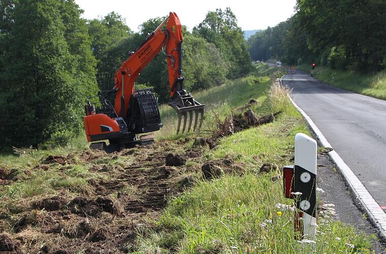 Autofahrer wundern sich: Eigentlich hätte seit Montag die Straße zwischen Wernarz und Rupboden voll gesperrt sein sollen. Doch noch rollt der Verkehr wie gewohnt durchs Sinntal. Auch die Ampel-Anlage an der Engstelle, wo ein Stück des Hangs abgerutscht war, ist noch in Betrieb. Am Dienstagmorgen ist ein einzelner Bagger am Straßenrand im Einsatz. Er zieht in Vorbereitung auf die Erdarbeiten für den Straßenausbau Wurzelstöcke aus dem Boden.