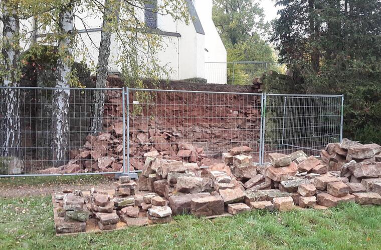 Die Arbeiten verlaufen nach Auskunft von Bauleiter Thomas Leitsch in mehreren Schritten. Zuerst einmal musste der Grünbewuchs entfernt werden, der die Mauer überwuchert und so im Laufe der Jahre zu massiven Schäden an deren Festigkeit geführt hat. Auch ein Teil der Bäume wird entfernt. Die einzelnen Steine wurden abgetragen, sortiert und seitlich gelagert.