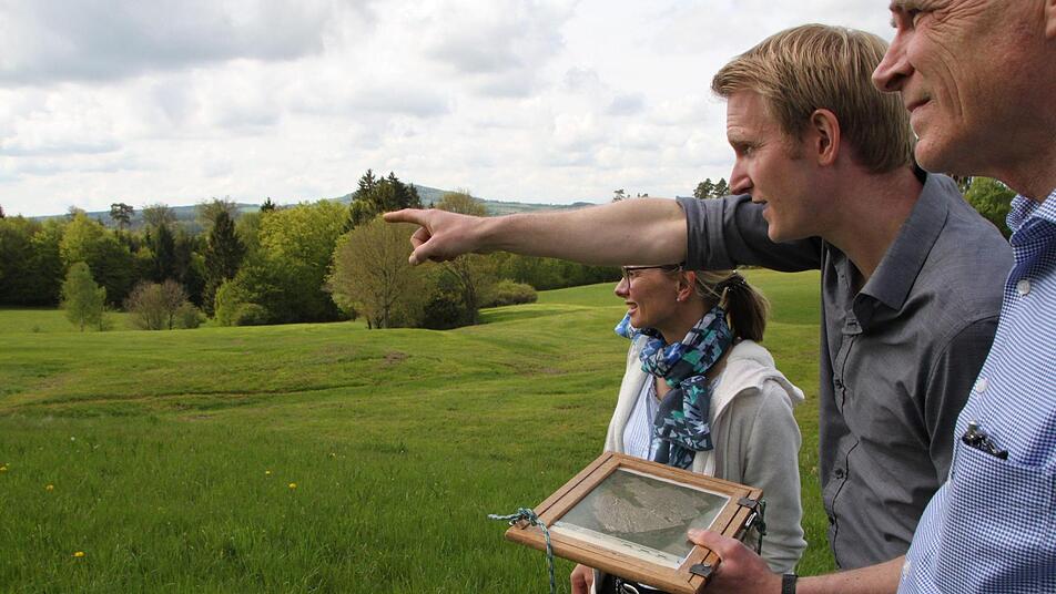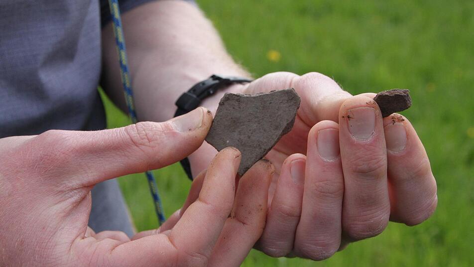 Gerhard Morber ließ diese Geschichte nicht los. Als die Schönderlinger im Herbst ihr 700-jähriges Bestehen planten, das Anfang Juli gefeiert werden wird, entschloss er sich, eine Führung zum Osterrain anzubieten. "Man müsste doch noch mehr über das verschwundene Dorf herausfinden", dachte er sich und stieß im November eine Untersuchung beim Bayerischen Landesamt für Denkmalpflege an. Dort half Ralf Obst weiter, und ein halbes Jahr später zeigt Nils Ostermeier vom Lehrstuhl für vor- und frühgeschichtliche Archäologie der Universität Würzburg eine Karte. "Wir haben mehrere Gehöfte mit insgesamt 20 Häusern gefunden, die aus dem 13. und 14. Jahrhundert stammen", sagt er. Mithilfe zahlreicher Fundstücke wie Scherben, Rotlehmbrocken oder dem Fragment eines Wetzsteins konnte das Team das Alter der Siedlung bestimmen. Sogar ein Feuersteinabschlag aus der Steinzeit sei dabei, berichtet er.