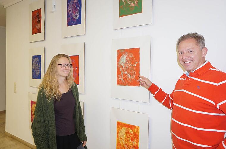 Druckgrafiken zu erstellen ist Bestandteil des Lehrplans, erklärt Fachlehrer Martin Bühner und künstlerischer Leiter der Schule. Die Anfertigung von Holzschnitten und das experimentelle Gestalten von Druckgrafiken wurde von den Schülern anhand von Portraits vertieft. Zunächst zeichneten die Schüler sich gegenseitig. Danach wurde in Ton modelliert und es wurden Druckgrafiken angefertigt. Rebekka Barth entschied sich für den Linolschnitt und begann mit Farben zu spielen. Sie druckte Farbe auf Papier, sie nutzte verschiedene Farben übereinander und schnitzte sie am Orginalportrait weiter, und legte zwei Drucke übereinander. So entstanden ganz unterschiedlich wirkende Werke, die aufgrund ihrer Farbigkeit und der Hintergründe ihre Wirkung entfalten.