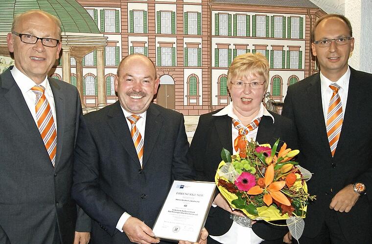 Am 16. August 1973 begann Heribert Jakobsche seine Ausbildung in der damaligen Volksbank in Bad Brückenau. Während Elvira Belz beinahe ihr gesamtes Berufsleben hindurch in Bad Brückenau tätig war, kam Jakobsche nach der Bundewehrzeit in Gemünden, Steinach und Garitz zum Einsatz. "Er war jung, dynamisch und einer breiten Öffentlichkeit bekannt", und so sei es laut Geis nur die logische Konsequenz gewesen, dass der Jubilar zum Hauptstellenleiter der Kurstadt ernannt wurde. Aufgrund seines Sachverstandes und Scharfsinns vertraute man dem verheirateten zweifachen Familienvater die Betreuung der Firmenkunden an. "Wir sind vor Ort, wir agieren vor Ort, wir finanzieren nicht ein Hotel auf Mallorca, sondern lieber einen Handwerksbetrieb in der Rhön. Und wir tun dies mit Menschen vor Ort", dankte Vorstandssprecher Hans Beudert allen Jubilaren des Abends dafür, dass sie die Kunden seit Jahren begleiten und zum Bankerfolg beitragen.