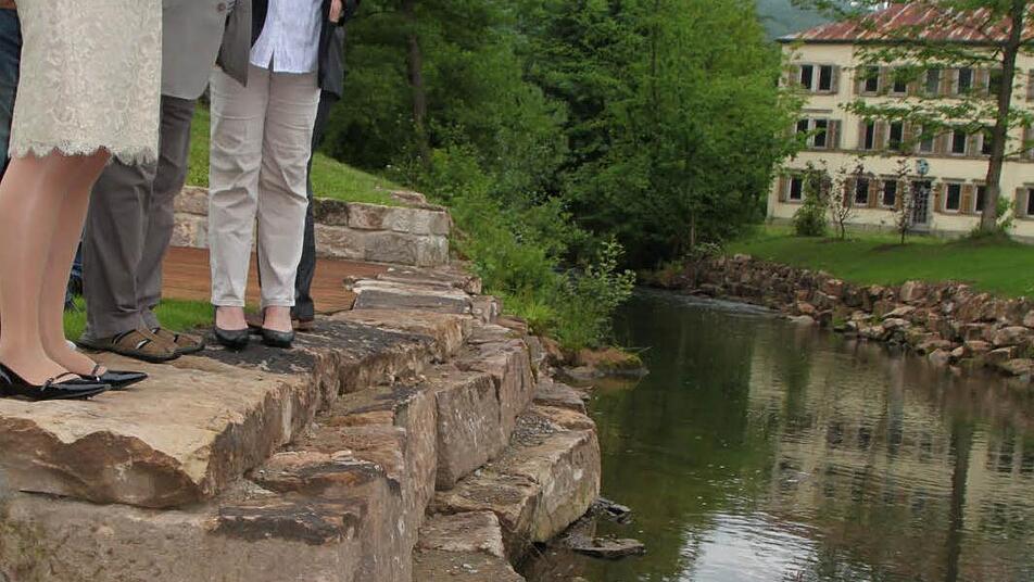 Planschen erlaubt Fische, wie die Äsche zum Beispiel. Armin Sauermann, Vorsitzender des Fischereivereins, und Erwin Trapp, ebenfalls im Vorstand, berichteten, dass die geschützte Art nur unweit des Sonnen-Plateaus laiche. "Die Brut steht", überzeugte sich Sauermann vor Ort selbst davon, dass es dem Nachwuchs gut geht. Und tatsächlich, die kleinen Fische tummeln sich an den Steinen unterhalb der 50 Quadratmeter großen Fläche munter im Wasser.