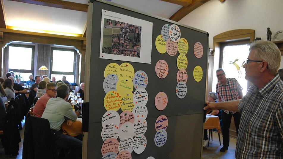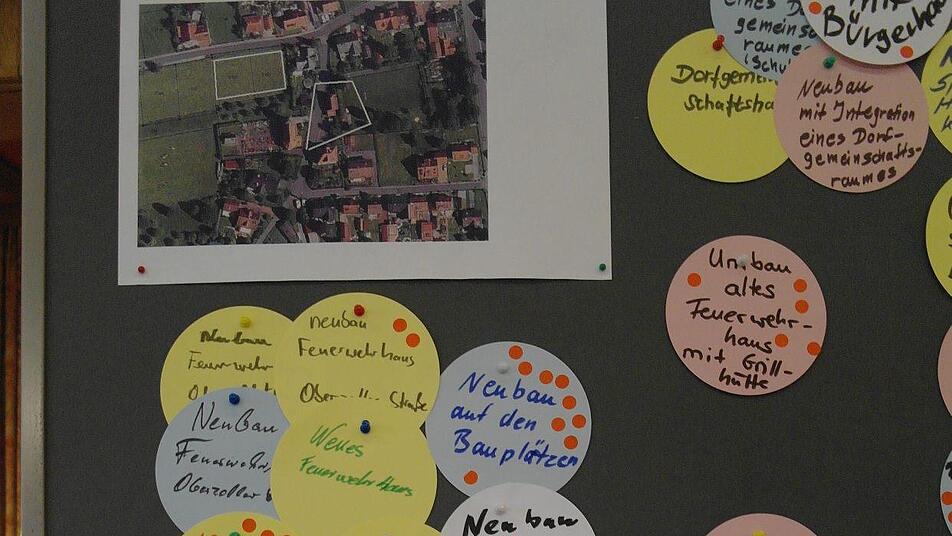 Nach Präsentierung der Vorschläge und Auszählung der gegebenen Punkte stellte sich tatsächlich heraus, dass auch die Erwachsenen ein neues Feuerwehrhaus wünschen. Uneinigkeit herrschte allerdings über den Standort. Sowohl ein Neubau in der Oberzeller Straße, als auch der Umbau des alten Feuerwehrhauses mit Umgestaltung des angrenzenden Spielplatzes erzielten fast die gleiche Punktzahl. Auch die Idee eines Bürgerhauses oder Dorfgemeinschaftshauses wurde gut angenommen.