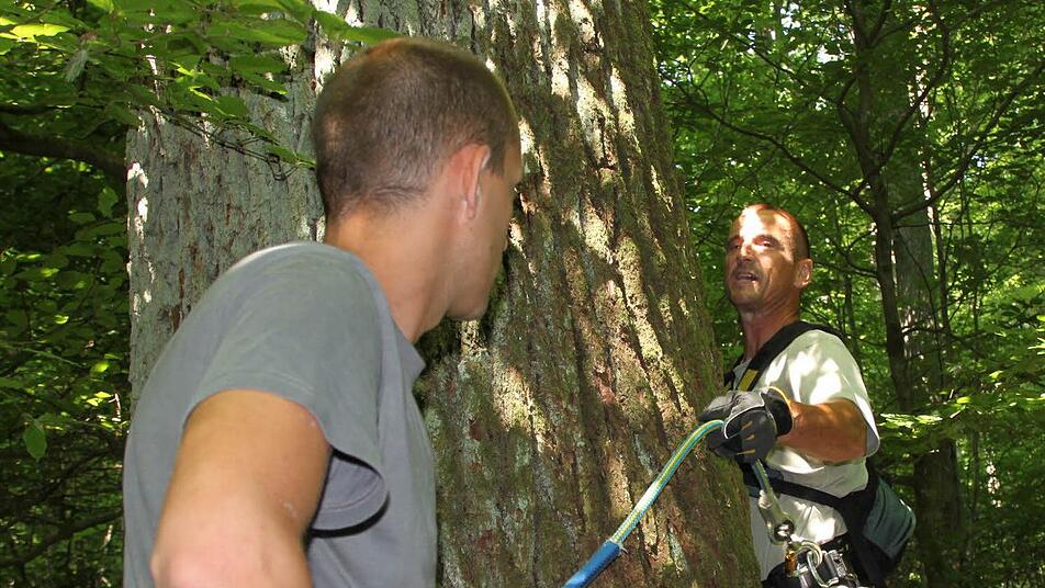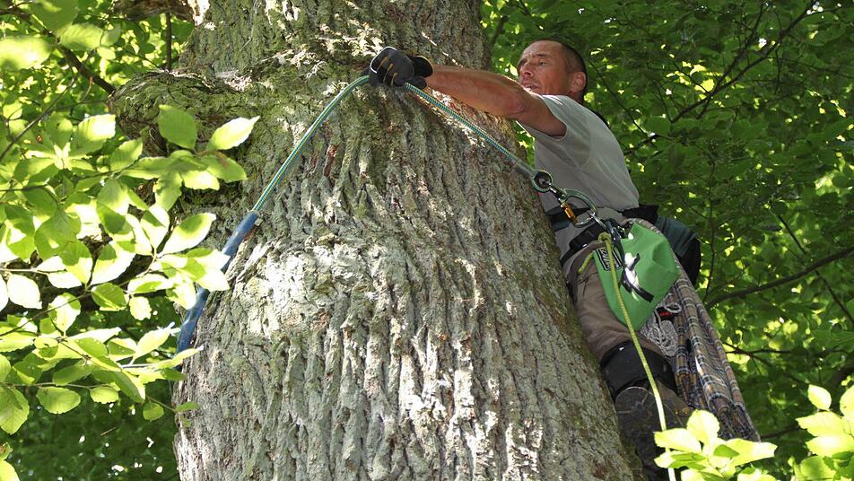 Ein markerschütternder Schrei entfährt Carsten Rohde. Mit ganzer Kraft wirft er das Seil, wieder und wieder. Der Stamm der mächtigen Eiche, die er erklimmen will, hat eine Verwachsung, und um die kommt er nicht herum. Der Baum steht im Salzforst im südlichen Teil des Landkreises Rhön-Grabfeld. Einige Meter über Rohde regt sich Protest. Die jungen Schwarzstörche richten sich in ihrem Horst auf. Was aus der Ferne wie wütendes Klappern klingt, sind Knack-Geräusche, die die Tiere ausstoßen, um ihre Feinde zu erschrecken.