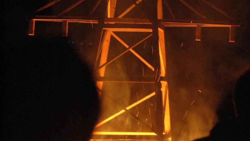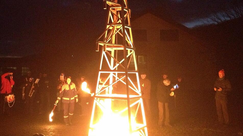 Bei der sonntäglichen Demonstration zündeten die Teilnehmer symbolisch einen eigens dafür gefertigten Holzmasten als Zeichen ihres Widerstandes gegen die Stromtrasse an.
