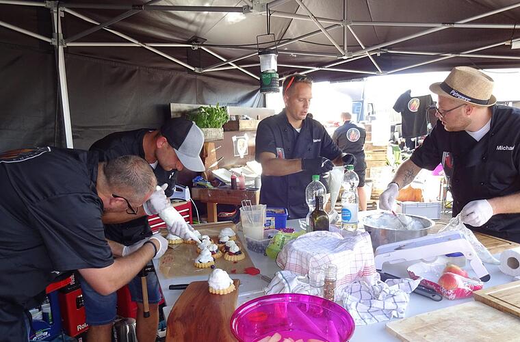 Wir - das war sein zehnköpfiges Team bestehend aus ihm selbst, seiner Ehefrau Carolin, sowie seinen Eltern Fred und Sonja Römmelt. Mit dabei war auch seine Schwester Janina und deren Freund André Pfützner, die Kumpels Manuel und Michael Schuhmann (letzterer kommt aus Oberbach) sowie Julian Fuß aus Oberleichtersbach und Arbeitskollege Tino Nöth aus Haard. "Wir haben uns vorher tatsächlich nur einmal zusammengesetzt und die vorgeschriebenen Gänge durchgesprochen, mehr nicht", erzählt Andy weiter. Der Team-Name "Grill-Bombers" wurde kreiert und dann war es soweit.