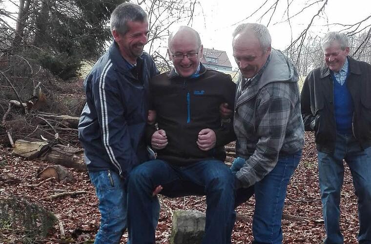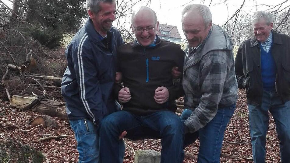 Die Feldgeschworenen-Obmänner Norbert Hergenröder (Riedenberg) und Herbert Kohl (Geroda) packten hierzu den 3. Bürgermeister aus Riedenberg, Peter Hergenröder, und vollzogen das Ritual.