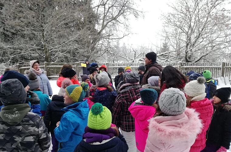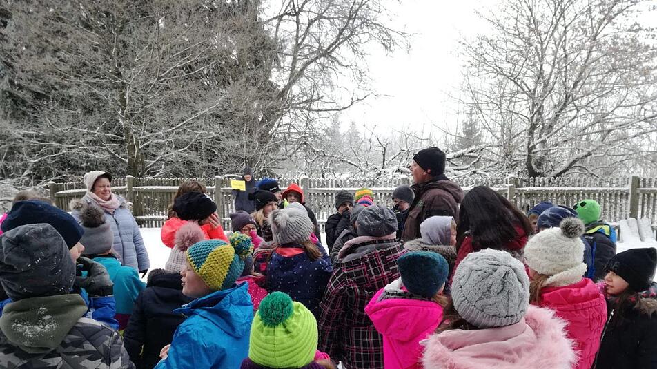 Mit dabei waren in diesem Jahr die Schüler der dritten Klasse der Grundschule Fladungen. Sie wurden von ihrer Lehrerin Sabine Thanisch und Michael Dohrmann vom Umweltbildungsteam begleitet. Ihr Startpunkt war der Rhönhof, allerdings haben sie nicht den direkten Weg gewählt, sondern sich unterwegs viel Zeit genommen, um das diesjährige Thema "Überwinterungsstrategien der heimischen Tiere und Tierspuren" zu bearbeiten.