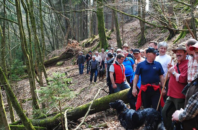 Die Feldgeschworenen des Ortes, allen voran Norbert Hergenröder und Günther Seuring, hatten in wochenlanger Vorarbeit die Grenzsteine in den Gemarkungsabschnitten Kapelli, Küppel, Lache, Bergfeld, Disbach, Grund und Grönni gesucht und gekennzeichnet und so den Grenzgang vorbereitet.