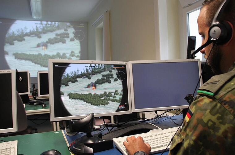 Der feindliche Panzer steht zwei Kilometer entfernt, am Fuße des Kleinen Auersbergs. "Entsichern", sagt Oberstleutnant Uwe Schirmer konzentriert. Daniel Hebner entsichert. Nicht die Waffe, er drückt eine Tastenkombination auf seiner Tastatur. "Drei, zwei, eins", sagt Schirmer. Hebner drückt ab. Der Bildschirm färbt sich grau. Erst als der Rauch abgezogen ist, wird der brennende Panzer sichtbar. Getroffen.