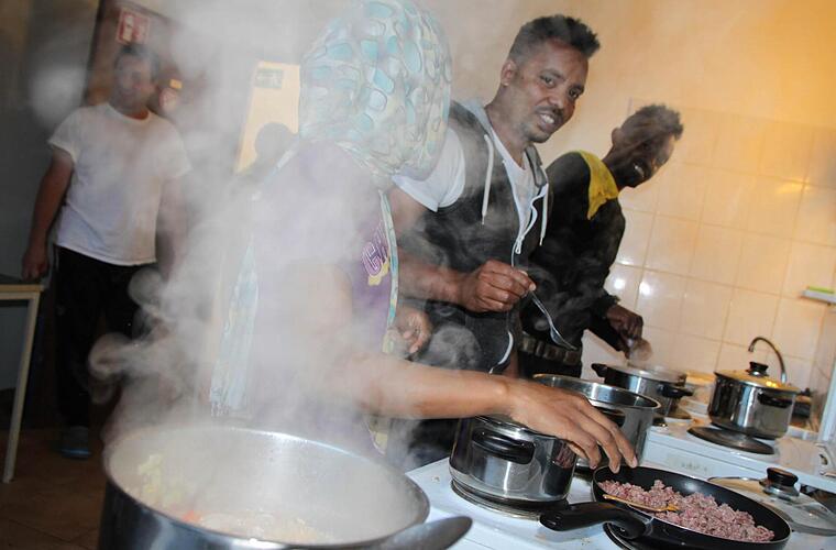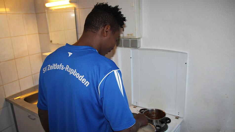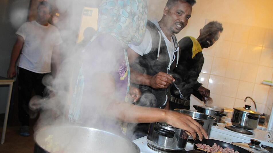 Es riecht nach Knoblauch und Gewürzen. Eine junge Frau, die ein bunt gemustertes Kopftuch trägt, steht am Herd in einer der Gemeinschaftsküchen der Flüchtlingsunterkunft in Volkers. Sie lacht schüchtern, genannt werden möchte sie nicht. Waleligne Zerga Degu (Mitte) und Daniel Eliyas - beide stammen wie die junge Frau aus Äthiopien - dagegen sind sehr offen. Sie scherzen miteinander, rühren im Reis, der vor sich hin kocht. Es herrscht Leben im ehemaligen Berghof Rhön. Zwischen 80 und 100 Flüchtlinge leben hier mitten unter den Volkersern.