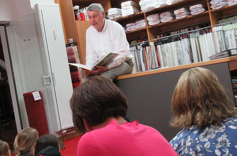 Kurz darauf erwartete Zweiter Bürgermeister Jürgen Pfister die Kinder in seinem Geschäft. Er las aus der Geschichte des Hundes Nelli vor, der für seine herausragende Spürnase bekannt ist und in einem besonderen Fall verschwundene Bücher aufspüren kann, die sich eine waschechte Leseratte "ausgeborgt" hatte. Nach der Geschichte galt es, ein kleines Rätsel zu lösen, doch die Kinder entpuppten sich als ebenso gute Spürnasen und wurden mit Süßigkeiten belohnt.