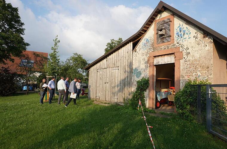 Der Außenputz am Gartenhäuschen des Kindergartens in Weißenbach ist ein  wenig in die Jahre gekommen. Kindergartenleiterin Lena Übelacker hatte  einen Antrag auf Sanierung beziehungsweise Streichen der Außenwand  gestellt. Die Mitglieder des Bauausschusses des Marktes Zeitlofs nahmen  die Gelegenheit für einen Ortstermin im Kindergarten wahr.