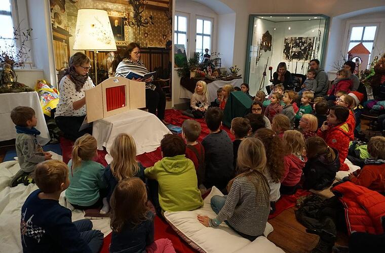 Naturnahe Materialien wie Holz und Baumrinde, bemooste Steine oder Pflanzen umranken die Figuren. Ein eigener Kosmos entsteht, und die Betrachter können in die idyllisch gestalteten Szenerien eintauchen und sich gegenseitig die Geschichten erzählen, die seit Generationen mündlich und schriftlich weitergegeben wurden.