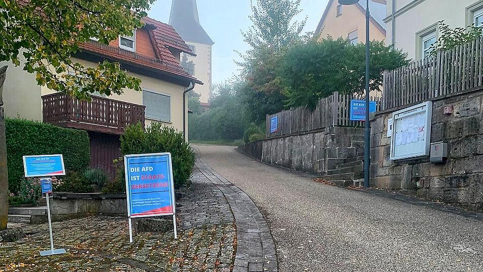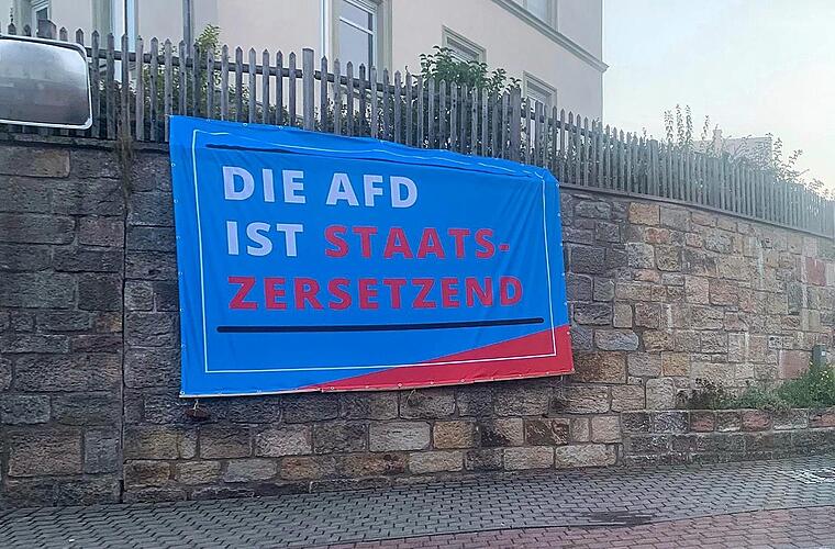 Als Alexander Richter mit ein paar Kollegen am Sonntag auf der Durchfahrt an der Gerodaer Tankstelle Station machte, fielen sie ihm gleich auf: blau-rote Plakate, Banner und Aufsteller, wie sie die Alternative für Deutschland (AfD) verwendet. Nur dass die Botschaften darauf der Partei kaum gefallen dürften, im Gegenteil: "Die AfD ist staatszersetzend" stand zu lesen. Und zwar auf nicht nur auf einem Banner unterhalb des Rathauses, sondern auch auf Aufstellern und an Gartenzäunen am Weg hinauf zur Kirche. Und auch den Ortseingang aus Richtung Schildeck zierte die Botschaft.