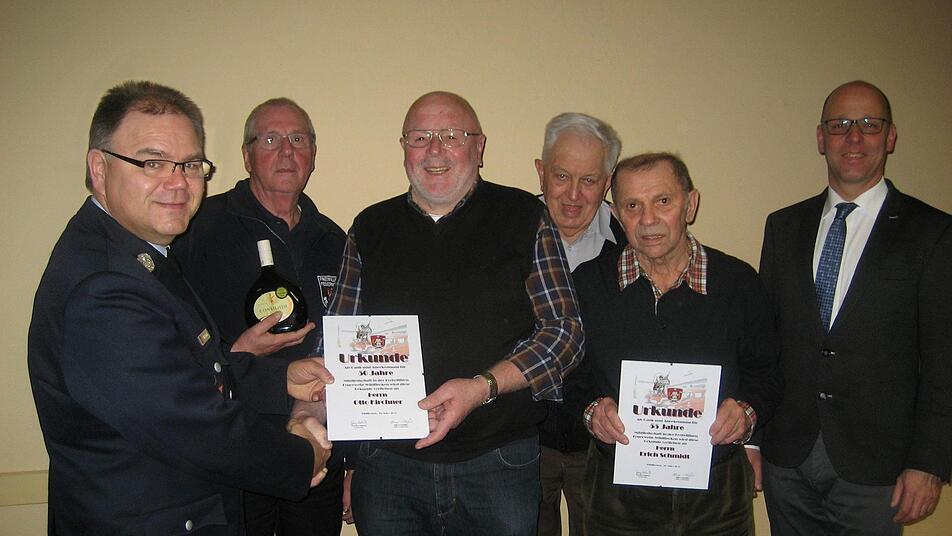 Langjährige Mitgliedschaft in der Freiwilligen Feuerwehr Wildflecken: Ottmar Bohn (55 Jahre), Otto Kirchner (50 Jahre), Walter Höhl (65 Jahre) und Erich Schmidt (55 Jahre) wurden bei der Versammlung geehrt. In Abwesenheit wurden Klaus Enders, Roland Fröhlich (beide 40 Jahre) und Heinrich Gundelach (55 Jahre) ausgezeichnet.