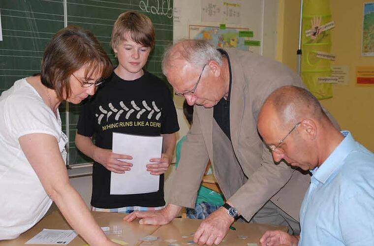 Nachdem die beiden Bürgermeister und viele Schüler aus den Mittelschulklassen die teils kniffligen Fragen mit Bravour gemeistert hatten, konnten sie sich nach einem Blick auf die kunstvoll und originalgetreu gestalteten Wappen der Orte und Städte und nach einem Besuch bei der "Rhönhilde", die fränkische Trachten zeigte, im Schülercafe einen von den Schülern gebackenen Zwiebelkuchen schmecken lassen. Allemal lohnte sich auch ein Besuch in der 3. Klasse, in der Süßspeisen und Getränke aus dem Landkreis Bad Kissingen probiert werden konnten. "200 Jahre Unterfranken" waren ein gelungenes Projekt, bei denen unsere Schüler/innen sich hervorragend präsentiert haben", lobte Rektorin Erika Hänlein.
