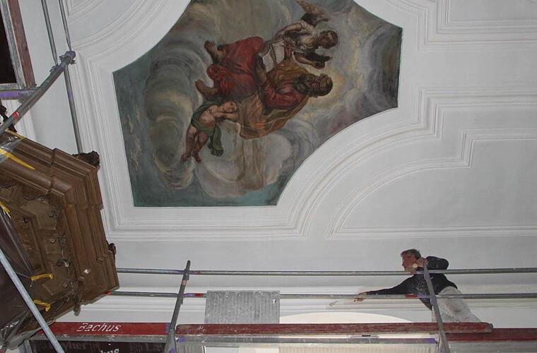 Das Kreuz auf dem Altar ist mit Folie verpackt, bis zur Decke hinauf stehen Gerüste im Innenraum der Zeitlofser Kirche. Markus Schmidgall steht ganz oben. Mit ruhigen Bewegungen trägt er Kalkfarbe auf. Der Restaurator aus Bad Mergentheim verwendet nicht irgendeine Farbe. "Der Kalk wird auf die individuellen Bedürfnisse der Kirche abgestimmt", erklärt Schmidgall. Für die Farbgebung verwendet er Pigmente, in diesem Fall Eisenoxidrot, Eisenoxidocker und Buchenholzkohlenmehl.