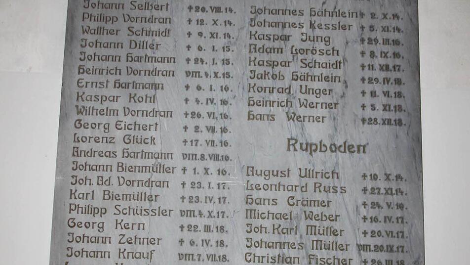 "Im Ersten Weltkrieg hat die Kirche völlig versagt!" Joachim Weichert entfährt dieser Satz, dabei ist er selbst ein Kirchenmann. Seine Frau Barbara ist Pfarrerin in Zeitlofs. Beide stehen vor der Gedenktafel, die in der Kirche in Zeitlofs rechts vom Altarraum angebracht ist. Die Namen der gefallenen oder vermissten Soldaten stehen darauf - allein für Zeitlofs sind es 23. Auch die toten Gemeindemitglieder aus Eckarts, Rupboden, Rossbach und Brückenau sind auf der Tafel notiert.