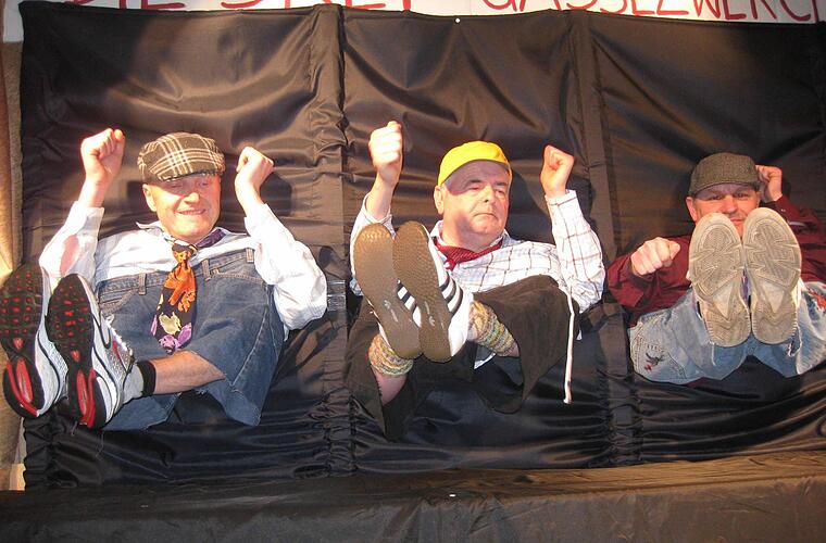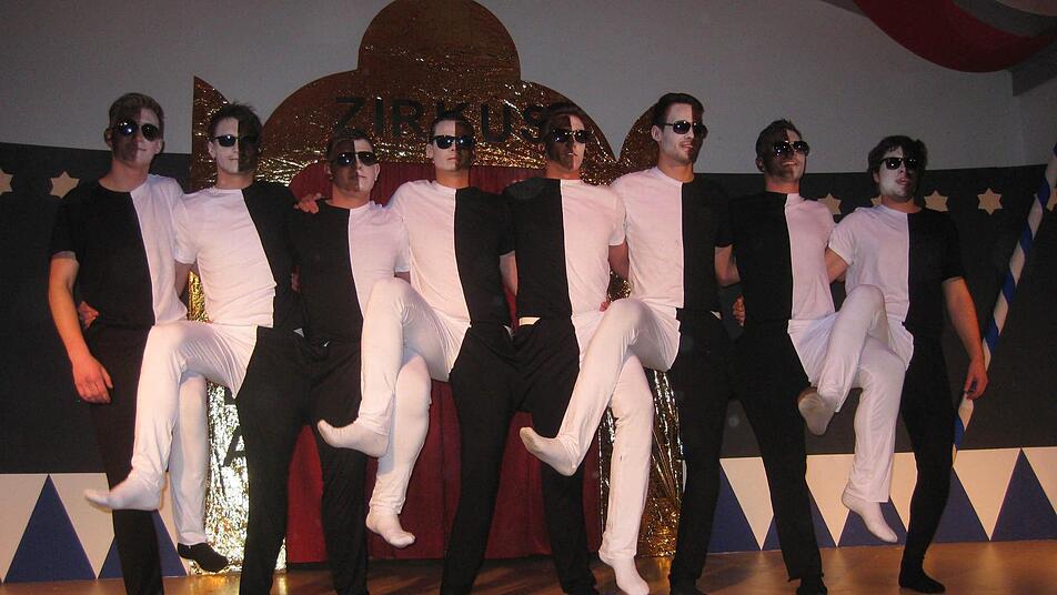 ganz groß rauskamen. Gleiches bewirkten die drei kleinsten Männer der Welt, die mit ihrem Gesicht einen ganzen Körper darstellten und den Song "Männer" zum Besten gaben. Klein waren auch die drei "Gasse zwerche", Stefan Schaab, Norbert Hahn und Bernd Fritz, die mit ihren Tanzkünsten wahrlich begeisterten. Schwarz-weißer Schlusspunkt war eine Auswahl der ersten Mannschaft, die zusammenhängend die Beine schwang.