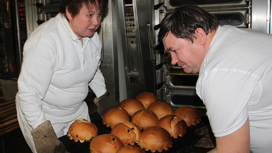 Es ist warm in der Backstube. Eben haben Elena und Alexander Hahn helle Rosinen-Brote in den Ofen geschoben. Nun läuft die Zeit. "Eigentlich ist das Osterbrot eine russische Tradition, die aus der orthodoxen Kirche kommt", erzählt Elena Hahn, Chefin der Bäckerei Löhmer. Doch die russlanddeutschen Familien haben diese Tradition übernommen - und mit nach Deutschland gebracht.