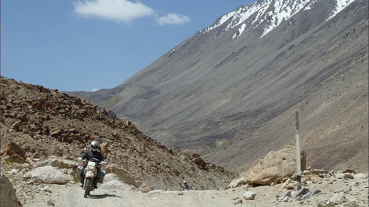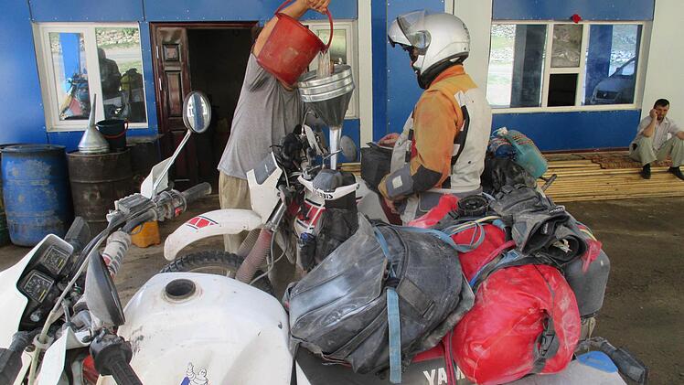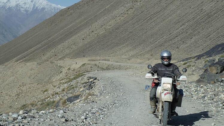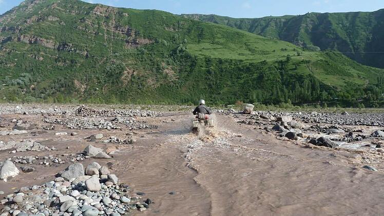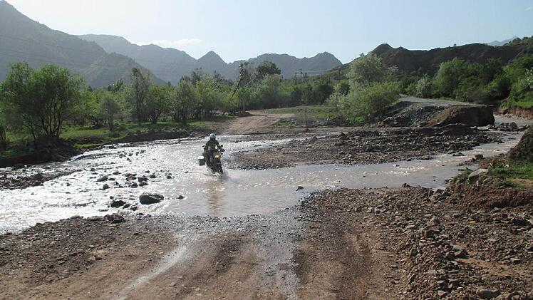 Kontrolle über sein Motorrad. Auch wenn die Yamaha Tenere XT 600 nur 160 Kilogramm wiegt, plus 40 Kilo Gepäck: "Alleine wäre ich da nicht mehr aufgekommen." Zudem blieb ihm eine Verletzung erspart. Auch mehrere Flussdurchfahrten mit einem halben Meter Tiefe und 20 Metern Breite wurden zum Hindernis: "Ein Umkippen des Motorrades auf dem glatt geschliffenen Geröll im Flussbett lässt sich nicht immer vermeiden, was mit einem unfreiwilligen Badevorgang im kalten Wasser
