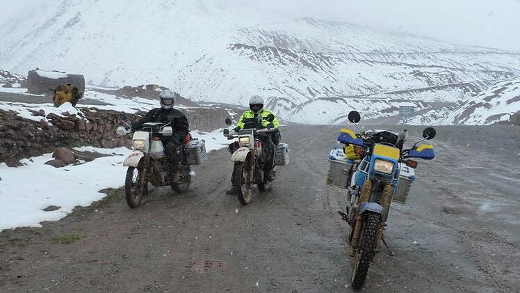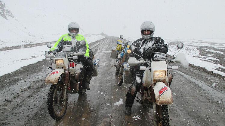 Bei dem Trip durch Zentralasien war alles dabei: Die drei Abenteurer fuhren bei 45 Grad in den Wüsten Usbekistans und minus 5 Grad am Kyzyl-Art-Pass an der Grenze nach Kirgistan, 30 Meter unter dem Meeresspiegel in Kasachstan bis zu fast 4700 Meter am Ak-Baytal-Pass.