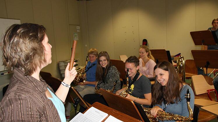 Auch wenn's die Generalprobe ist: Lustig geht's zu, wenn Lehrerin Barbara Bieber mit der Schul-Big-Band übt. "Die gibt es jetzt im vierten Jahr", berichtet die Musiklehrerin. "Vorher war's eher ein bunt gemischtes Orchester", sagt sie über das Vorgänger-Ensemble, und: "Seitdem haben wir uns gut gesteigert, es wird Jahr für Jahr besser."