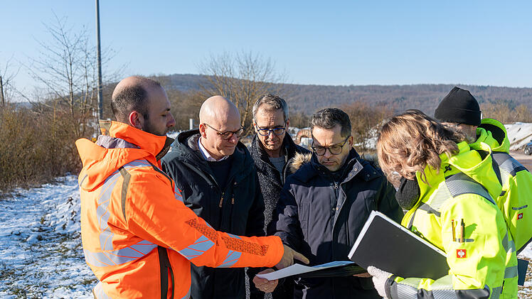 Oberbürgermeister Dr. Dirk Vogel verschafft sich ein Bild von den aktuellen Baumaßnahmen im zukünftigen Gewerbegebiet Kaserne Nord (v.l.n.r Alisa Knüttel, Stadt und Verkehrsplanung; Michael ...
