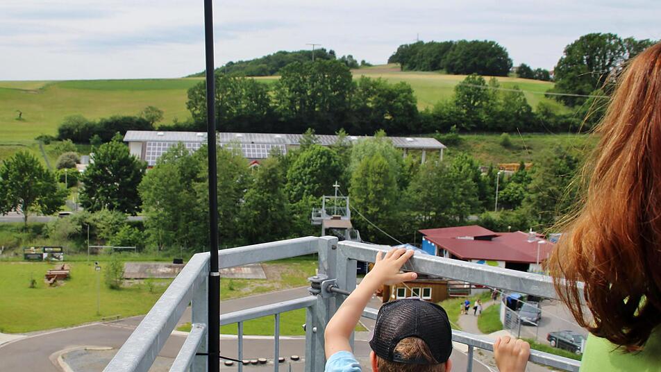 Nach dem Basteln geht es 80 Stufen hoch auf den Kletterturm des Kisspark, immerhin 15 Meter hoch. Hinaus auf die luftige Rampe, Kommando abwarten und dann das Flugobjekt auf die Reise in den blauen Himmel schicken. Unten kommentiert DJ Franz die segelnde, taumelnde oder stürzende Flugbahn und stoppt die Zeit, bis die Papierflieger gelandet sind. Stadtrat Florian Keßler (DBK) und Frau Liane gehen zu dritt an den Start. Sie haben auch für ihren Sohn Hannes einen Flieger gebastelt. "Charles Victor" haben sie den Segler getauft. "Charles Victor" will sich nicht blamieren, segelt elegant in weiten Kurven nach unten und ist nach 18 Sekunden im Gras gelandet. Lianes "Top Gun" kommt in einen Luftwirbel und schmiert schon nach 12 Sekunden ab, aber "Eddy the Eagle" von Florian knackt den bisherigen Rekord und landet erst nach langen 21 Sekunden auf dem Boden.