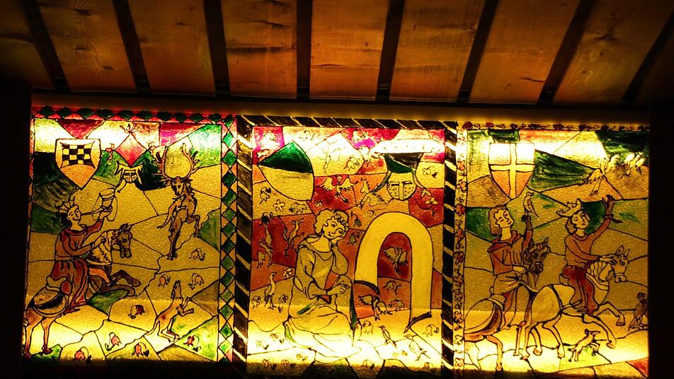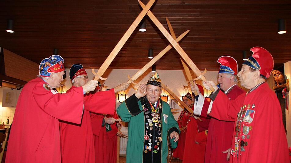 Auch in Bad Kissingen ist das Reych überaltert: 162 Ritter gab es seit der Gründung, jeder mit eigenem Wappen, das in der Burg hängt: Links die der Verstorbenen, rechts die der  31 noch lebenden Ritter.  Für die Verstorbenen gibt es einmal im Jahr auch eine "Ahalla"-Feier. "Das Durchschnittsalter liegt bei weit über 70 Jahren", berichtet Lotter. Selbst der aktuelle Prüfling, der sich um eine Aufnahme bewirbt, ist bereits 70 Jahre alt (siehe rechts). "Daher werden auch immer Jüngere gesucht."