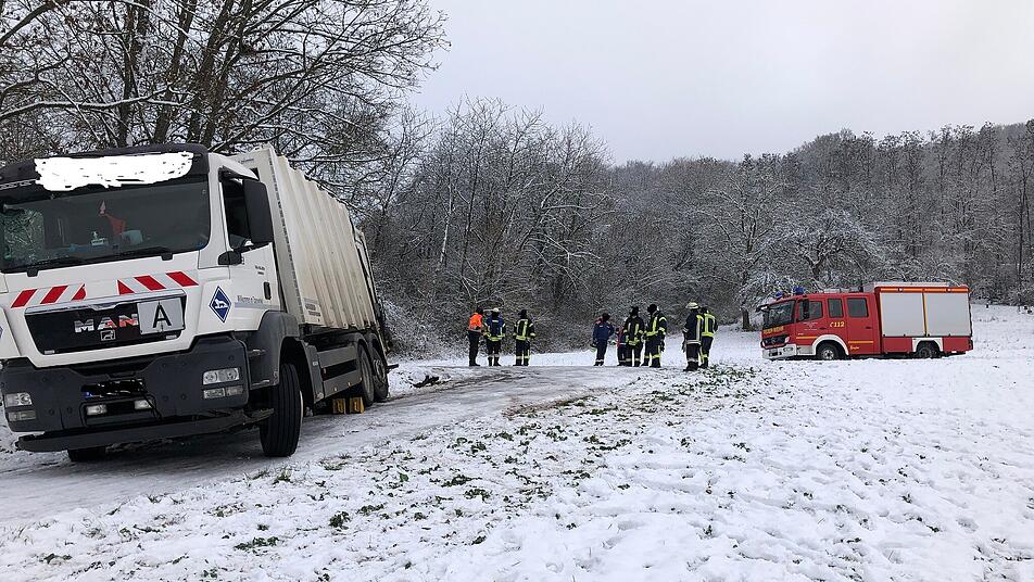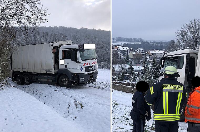 Gegen 15 Uhr seien die Einsatzkräfte "zu einem Verkehrsunfall mit einem Lkw" gerufen worden. "Ein Müllwagen ist auf schneeglatter Fahrbahn in einen Graben gerutscht", berichtet die Feuerwehr Arnshausen. Zudem habe sich der Mitarbeiter der Müllabfuhr am Fuß verletzt, als er aus dem Wagen ausgestiegen und auf der glatten Straße ausgerutscht sei. Bis der Rettungsdienst eintraf, habe die Feuerwehr die Erstversorgung des Verletzten übernommen und den Bereich um das Fahrzeug geräumt.