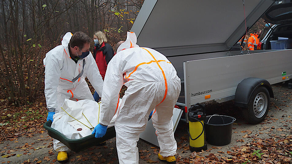 Die theoretische Ausbildung im Frühjahr wird nun durch eine praktische Ausbildungs- und Übungseinheit ergänzt, die auf Initiative des Forstbetriebs Bad Brückenau durchgeführt wird. Sie umfasst sämtliche Schritte - vom Anlegen der Schutzkleidung über die Beprobung der Schweine bis zur Bergung und dem Abtransport des Fallwildes.