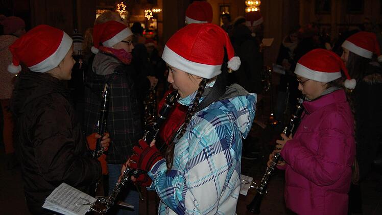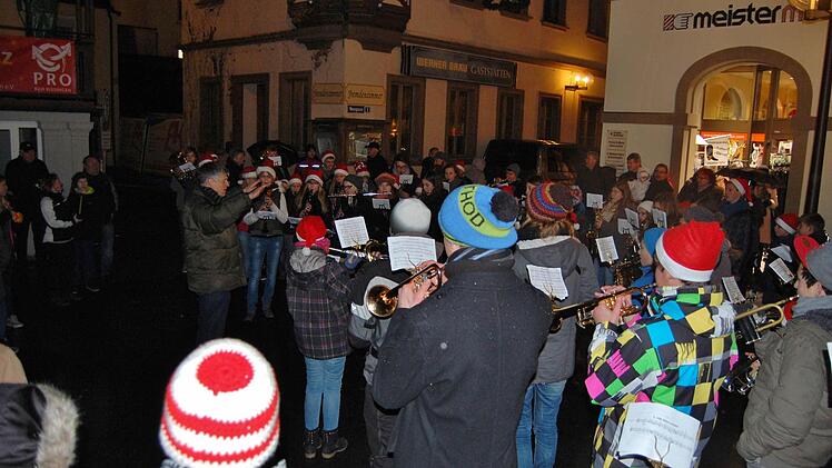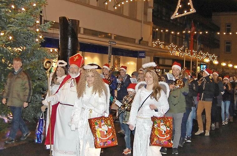 Danach zogen das Jugendmusikkorps und alle Kurgartenbesucher, angeführt von Nikolaus und Weihnachtsengel, durch die beleuchteten Einkaufsstraßen zum Marktplatz. Hier warteten schon dicht gedrängt die Besucher auf die offizielle Eröffnung durch Heiko Grom, den Vorsitzenden von "Pro Bad Kissingen". Er hob hervor, dass der Weihnachtsmarkt