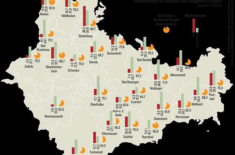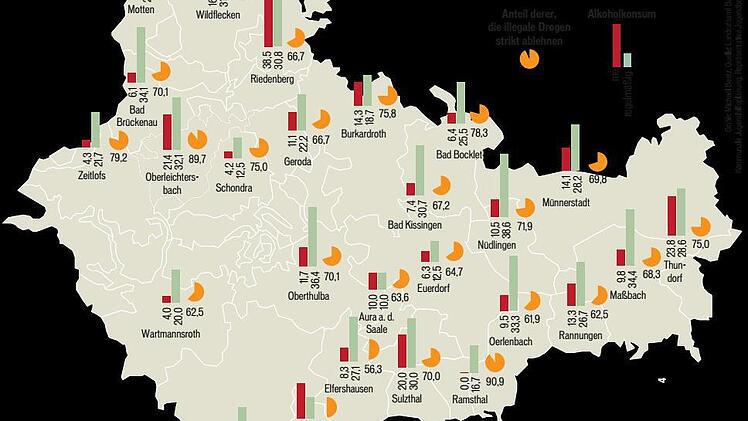 Gefragt wurde auch nach illegalen Drogen: Sollten weiche Drogen wie Haschisch legalisiert werden? Sollte bei illegalen Drogen härter durchgegriffen werden? Zwei Mal "Nein" sagten dazu 69,9 Prozent, 1999 waren es noch 75,8 Prozent. 19,4 Prozent sind für die Legalisierung von Haschisch und Co., rund ein Viertel fordert kein härteres Durchgreifen. Die strikte Ablehung illegaler Drogen ist allerdings regional sehr unterschiedlich: von 92,6 Prozent in Motten bis gerade einmal 54,5 Prozent in Fuchsstadt.